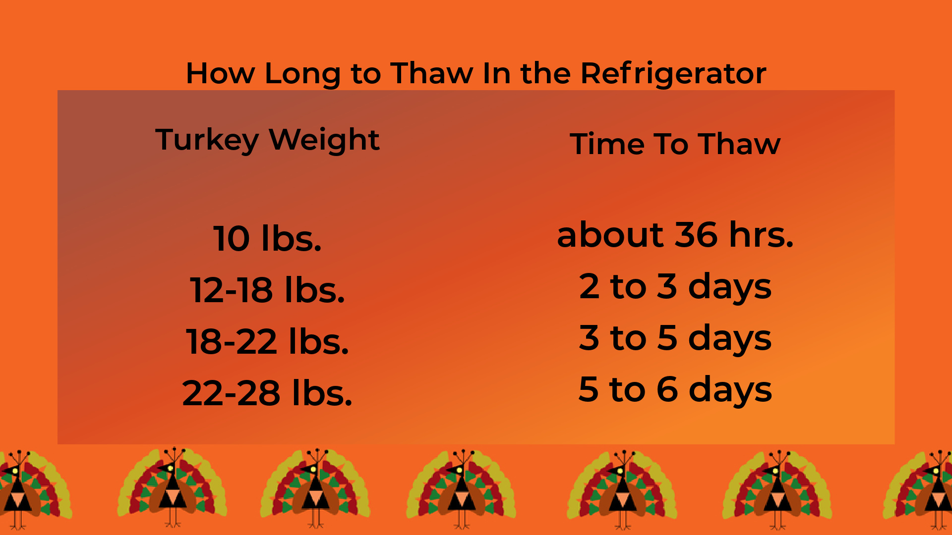 Plan on 24 hours of fridge thawing for every 5 pounds of frozen turkey for example. 4 hours to defrost. So for a 12-pound turkey that would imply at least three days of thawing ideally with a bonus day thrown in. If you call around you can find fresh the day before o.